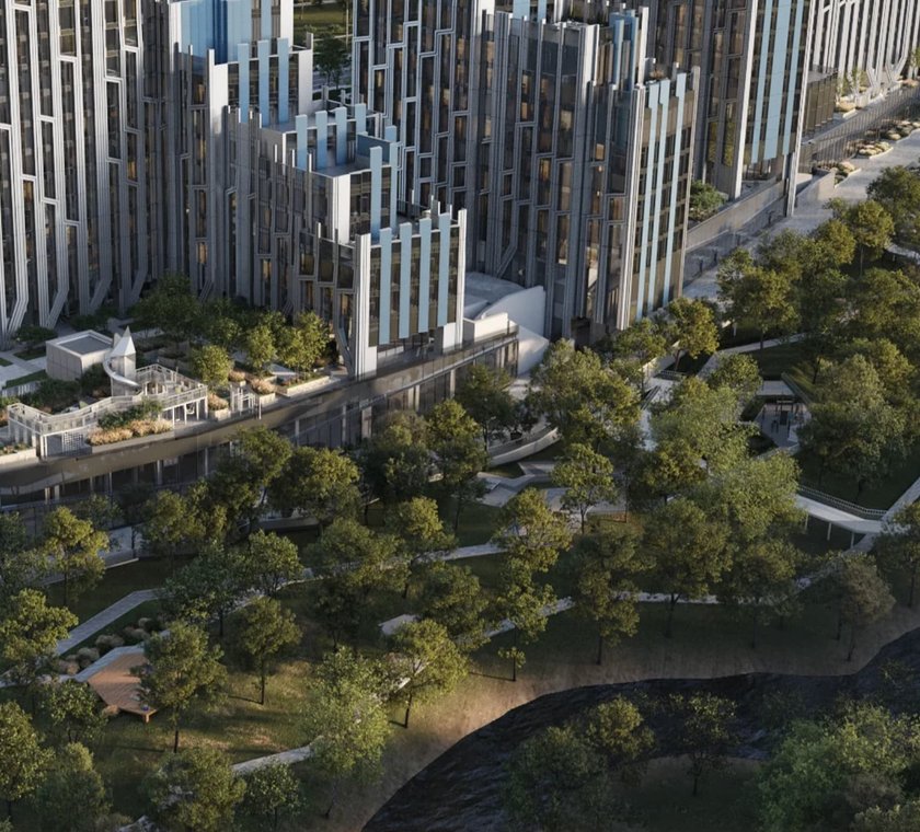 Корпуса переменной этажности от 2 до 58 этажей на едином стилобате. Архитектурная концепция — KAMEN Architects.